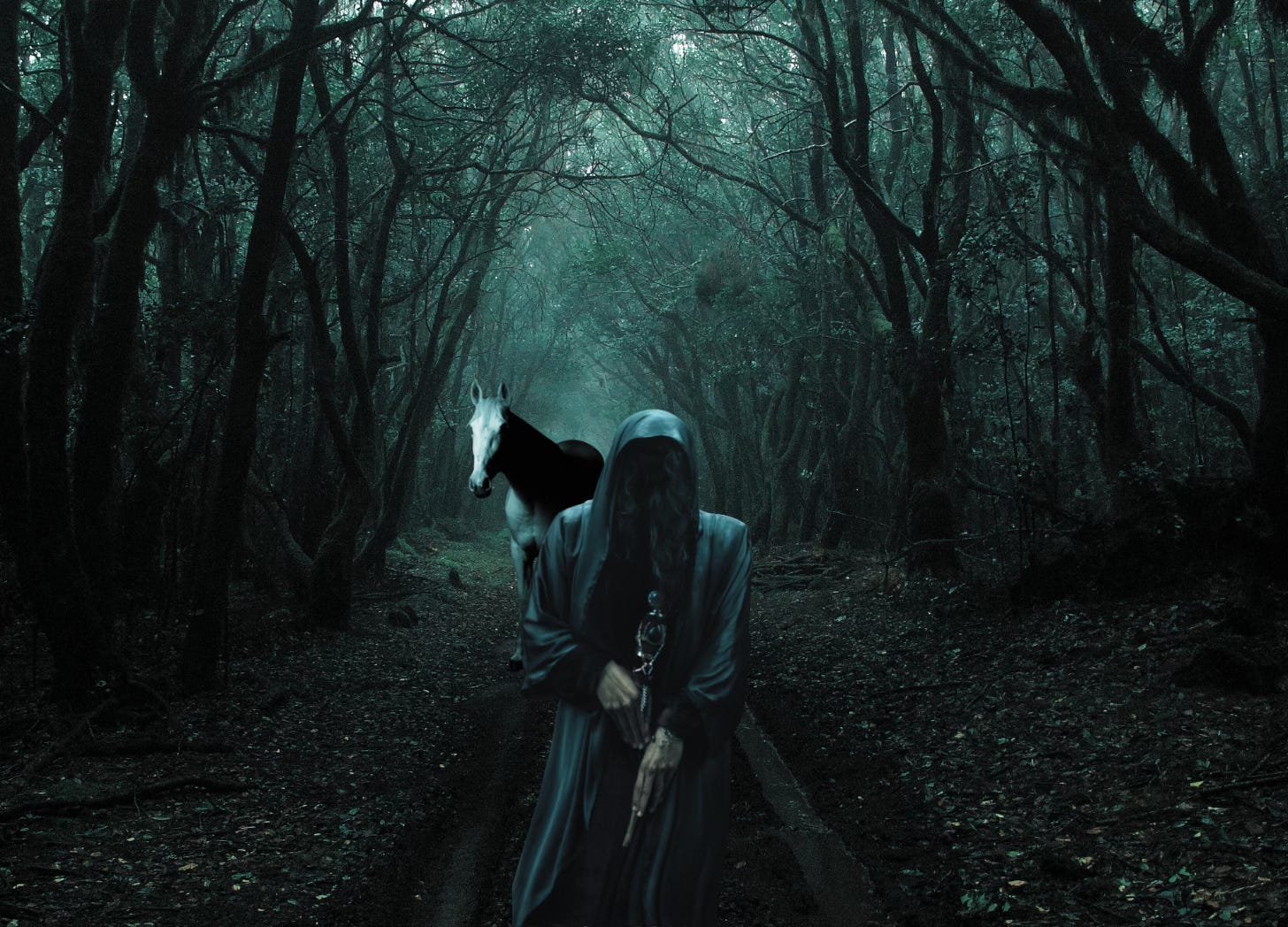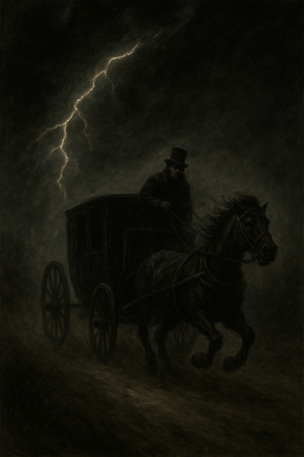 The horses tore away but soon came to a halt. The wind howled, and from a swirl of dirt and dust, there appeared a tall, black figure in the midst of the road—the coachman sank into his seat, quaking uncontrollably, and the horses began to stomp and snort in fear.